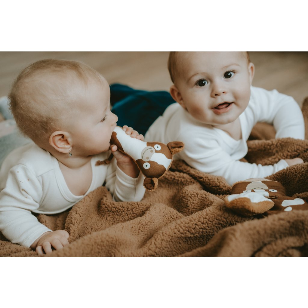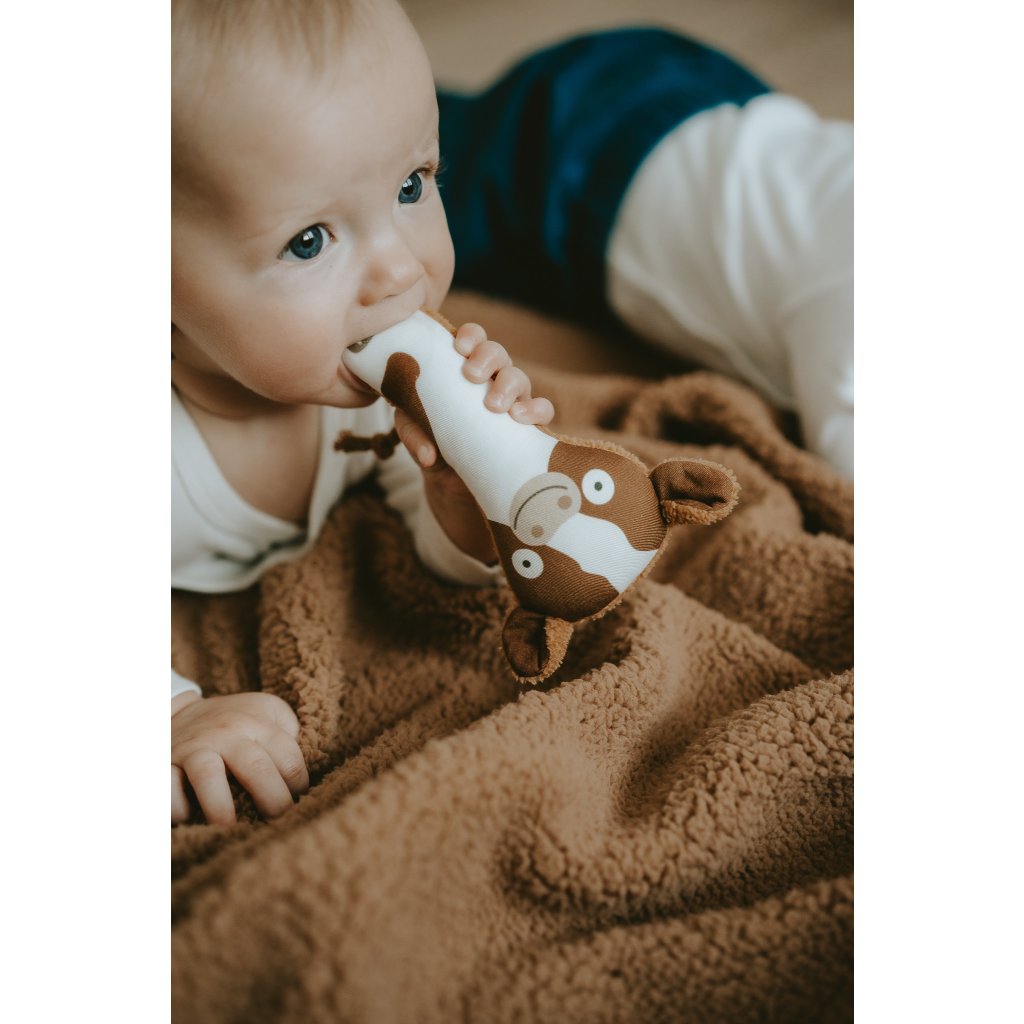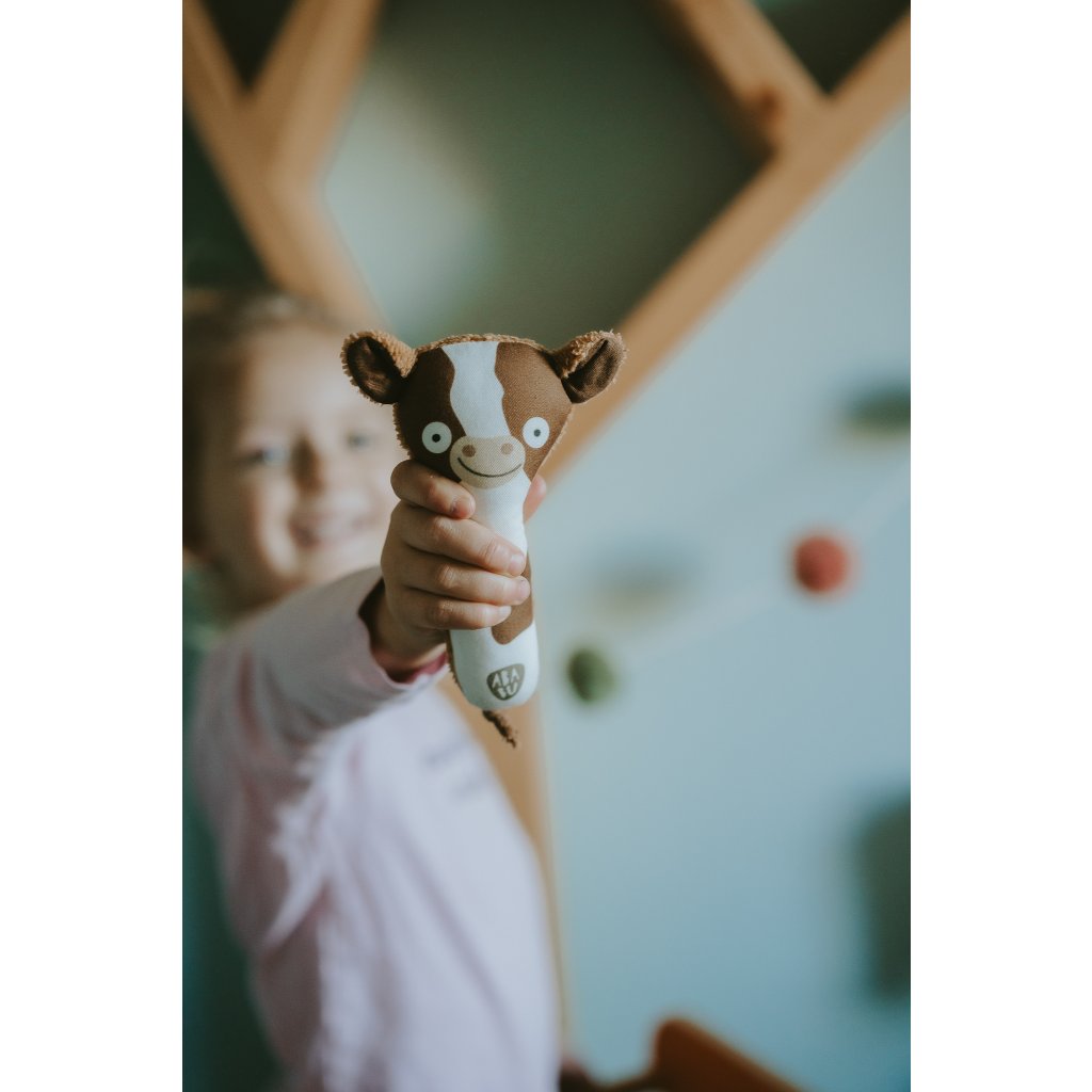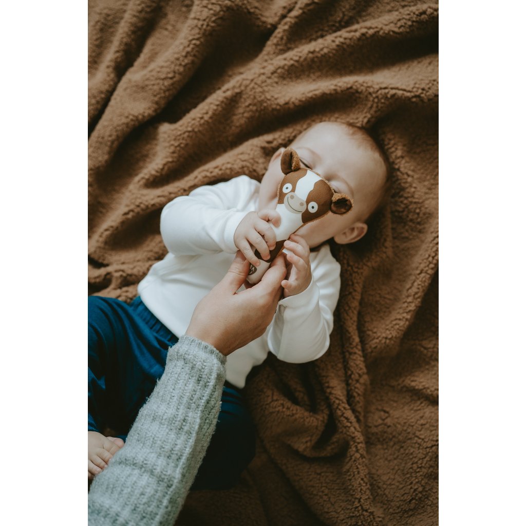 Jsem parťák pro miminko, kterému pomáhám v rozvoji motoriky a sluchu. Můj tvar a velikost je ideální pro malé dětské ručičky. Při pokusech o první úchopy jemně chrastím.