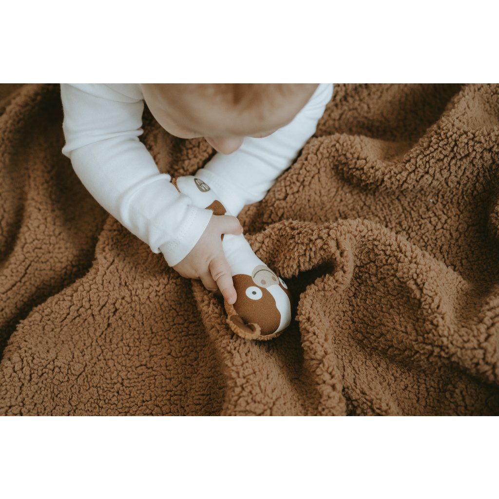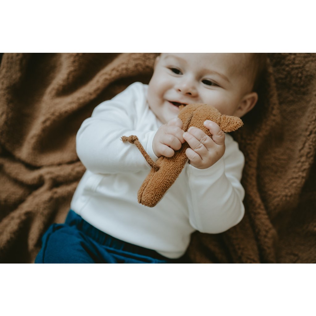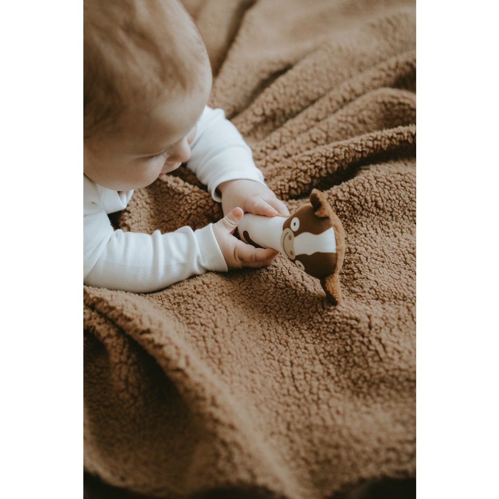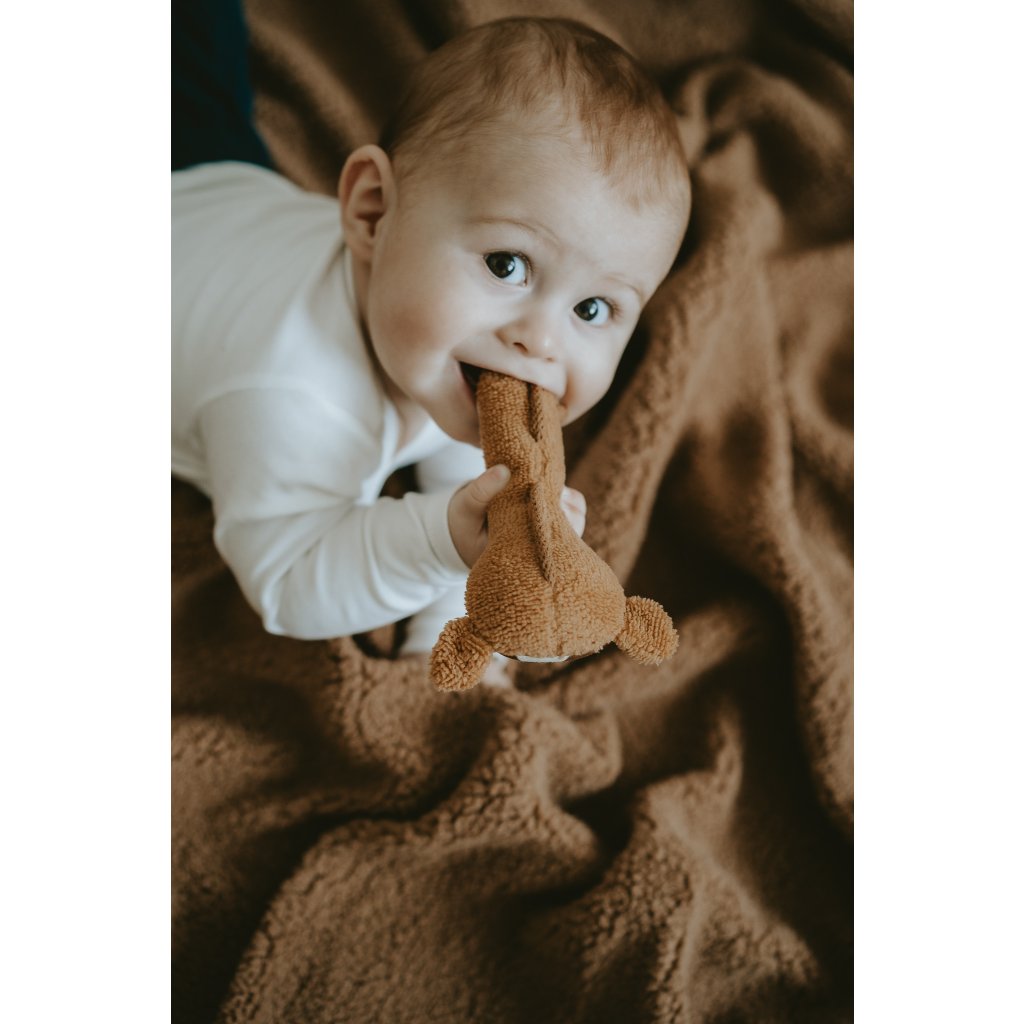 Jsem parťák pro miminko, kterému pomáhám v rozvoji motoriky a sluchu. Můj tvar a velikost je ideální pro malé dětské ručičky. Při pokusech o první úchopy jemně chrastím.