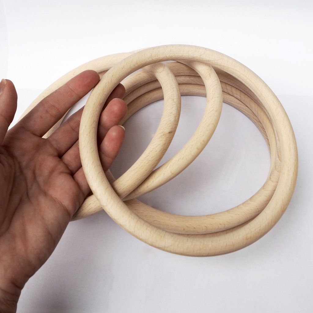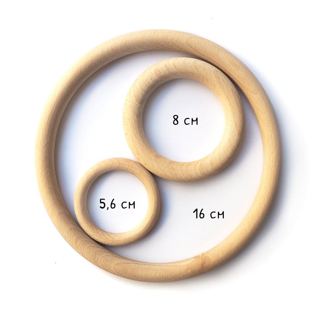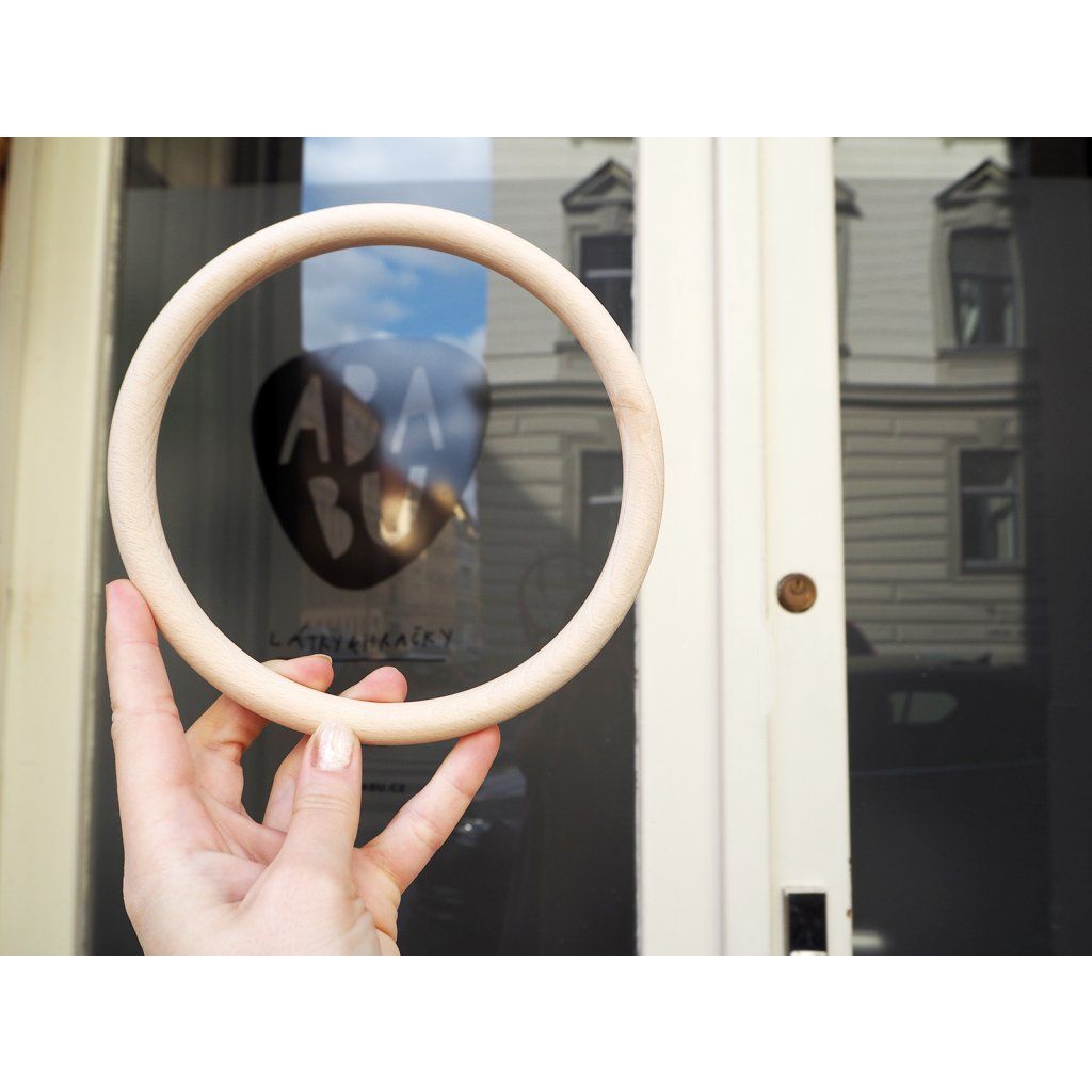 Obří dřevěný kroužek z bukového dřeva o rozměru 160 mm. Nelakovaný a nijak neupravovaný. Narozdíl od jiných kroužků na trhu je vyráběný ručně a ne strojově - nemá žádné třísky, vnitřní ostrou hranu a je jemně vybroušený do hladka. Vyráběný na míru pro moji značku na Vysočině.