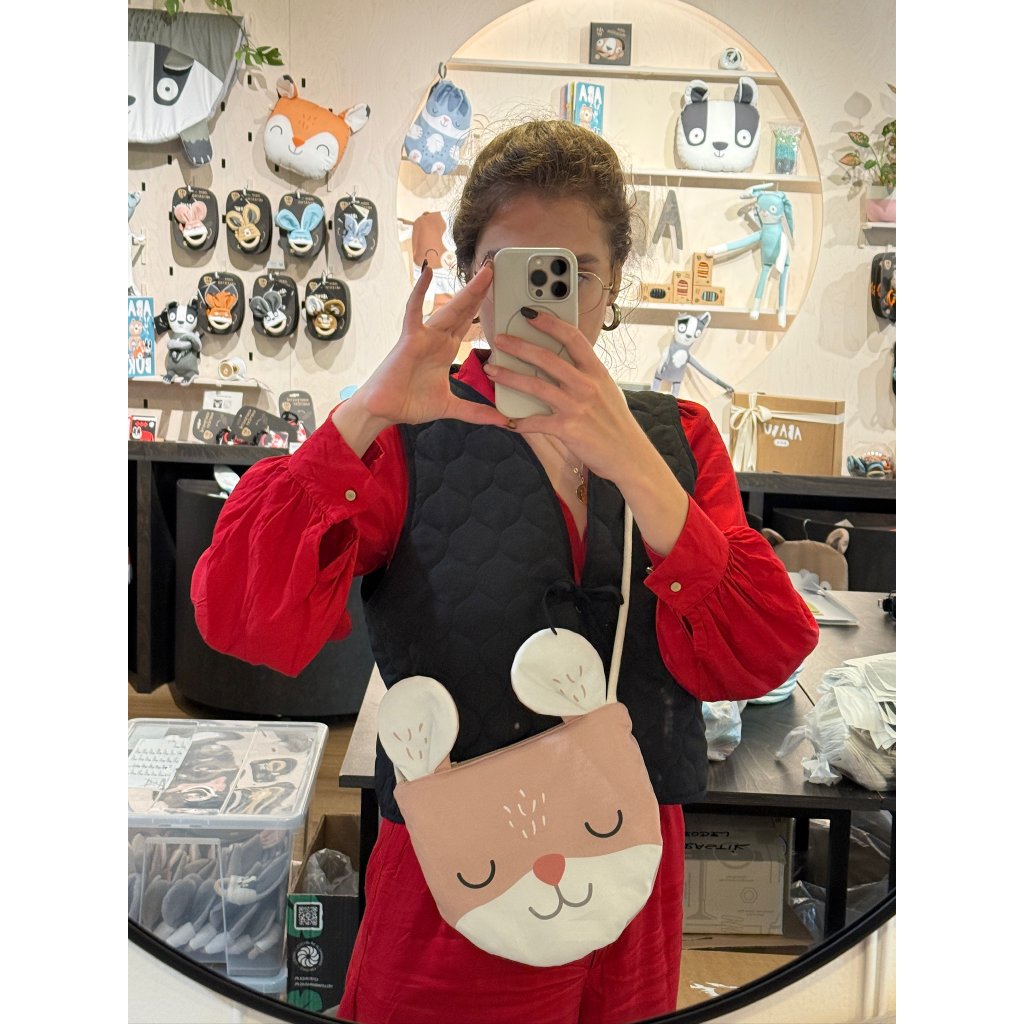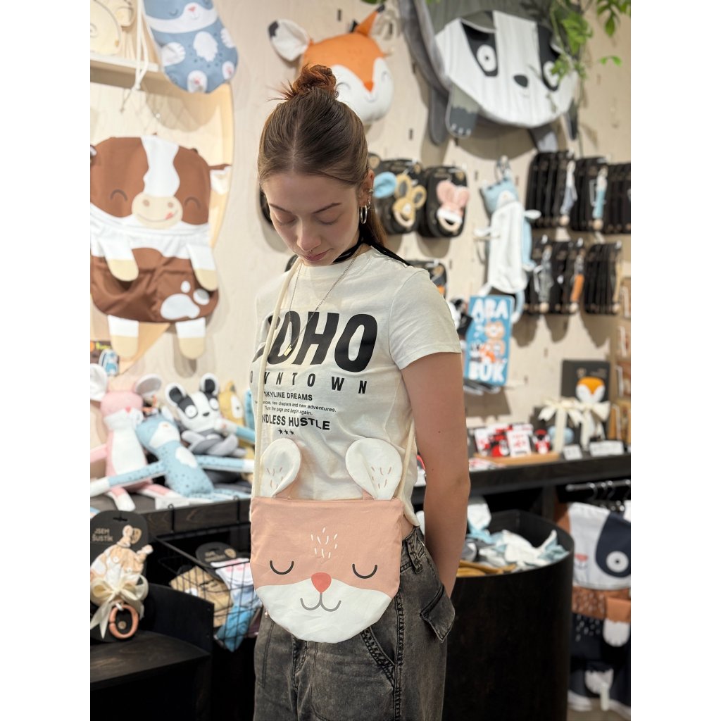 Větší kabelka z bavlněného materiálu se zipem a delší bavlněnou šňůrkou. Má roztomilá ouška a uchová spoustu pokladů a všitý zip nedopustí ztrátu cenného obsahu. Peněženka, klíčenka, cestovní kapsička - pro malé i velké. Ideální na přenos sluchátek pro děti, má perfektní velikost.