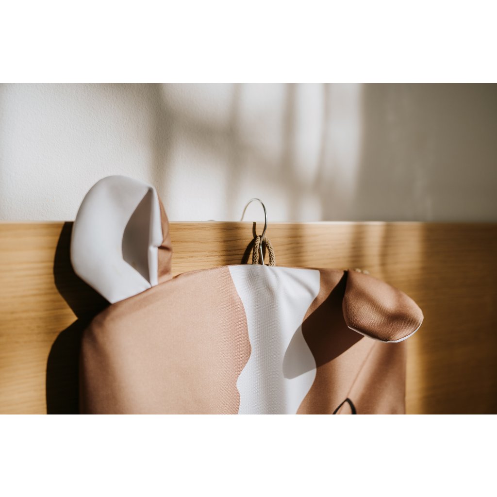 Kapsář má ideální velikost, skvěle drží tvar a díky třem způsobům zavěšení jej snadno upevníte na kdejaký školkový háček, zezadu na přední sedadlo auta nebo na postýlku. Součástí balení je dřevěné ramínko poctivé české výroby.