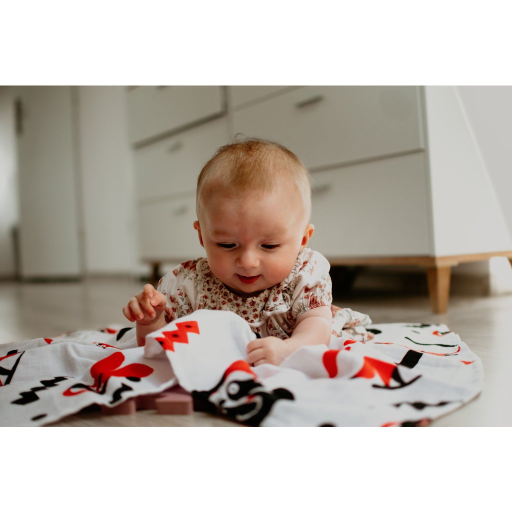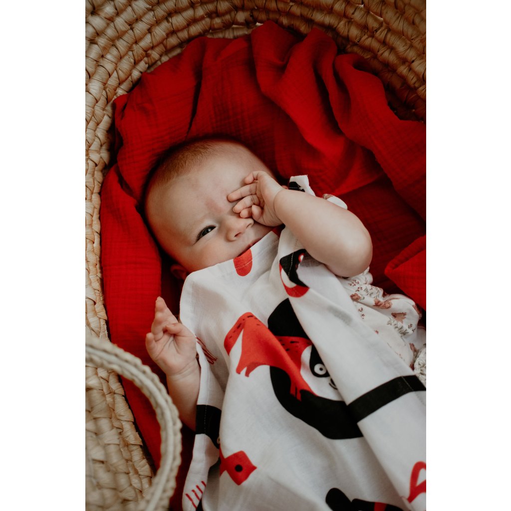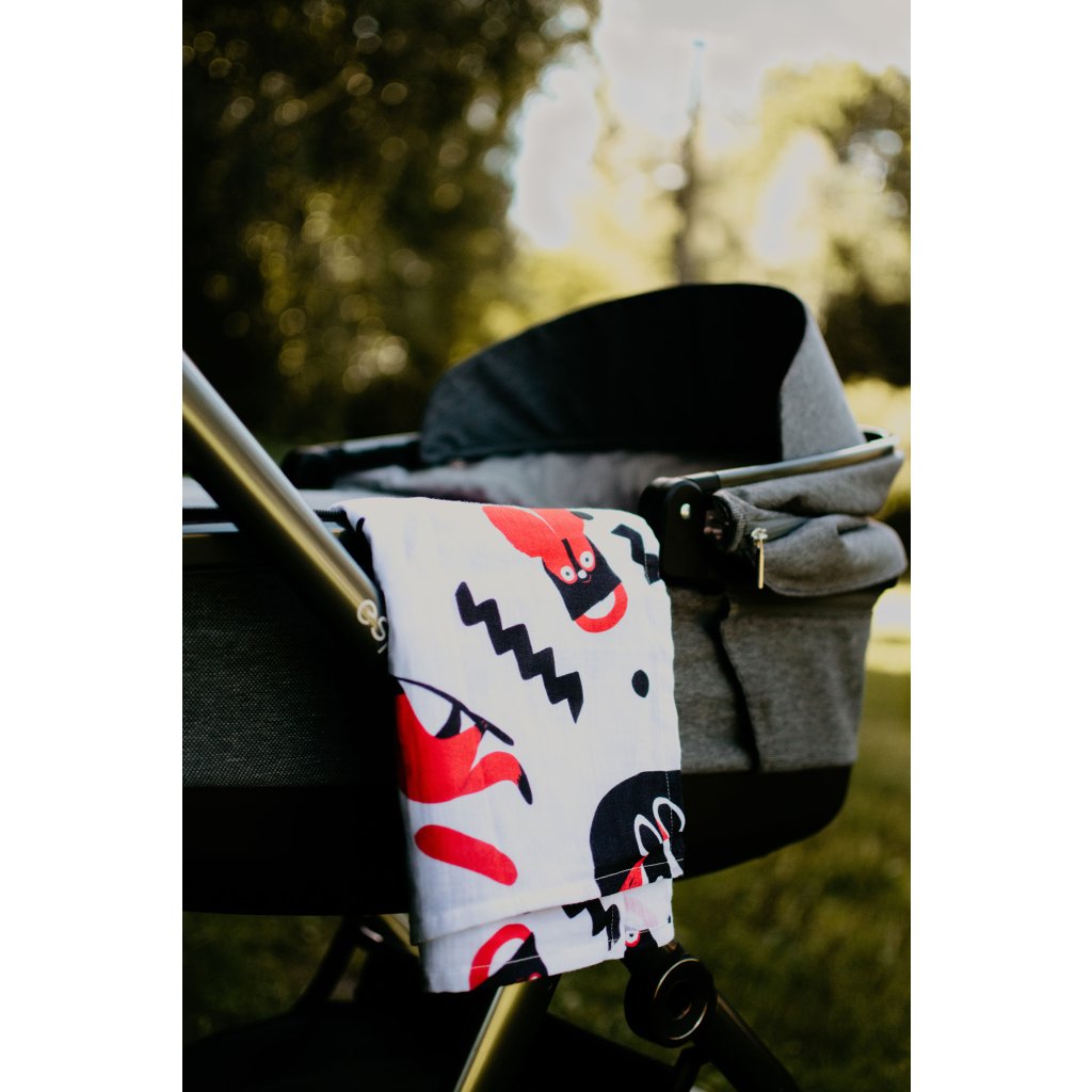 Kontrastní červeno-bílá mušelínová plena s autorskými ilustracemi od Patrika Antczaka není jen obyčejná plena. Je to praktický pomocník, který podporuje vývoj zraku, nervového systému i první motoriky miminka — přirozeně, jemně a zábavně.
