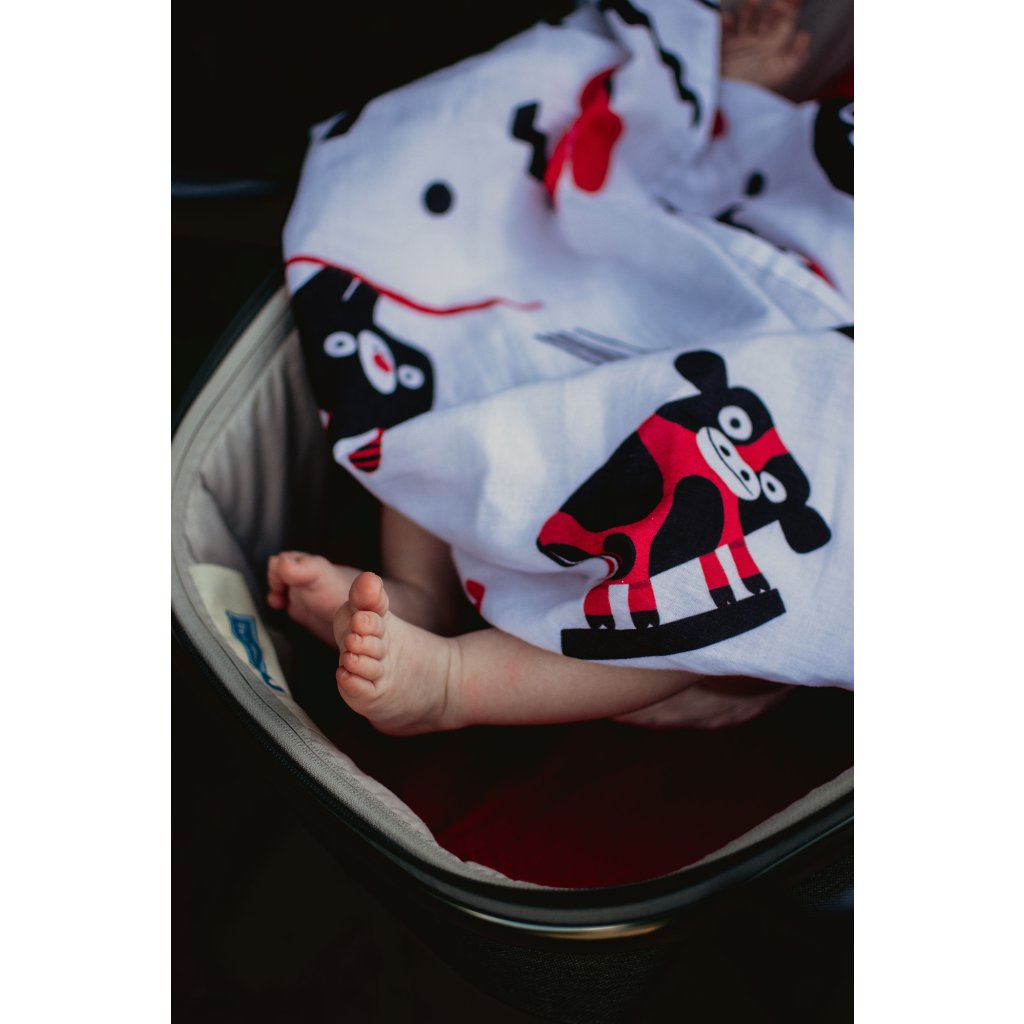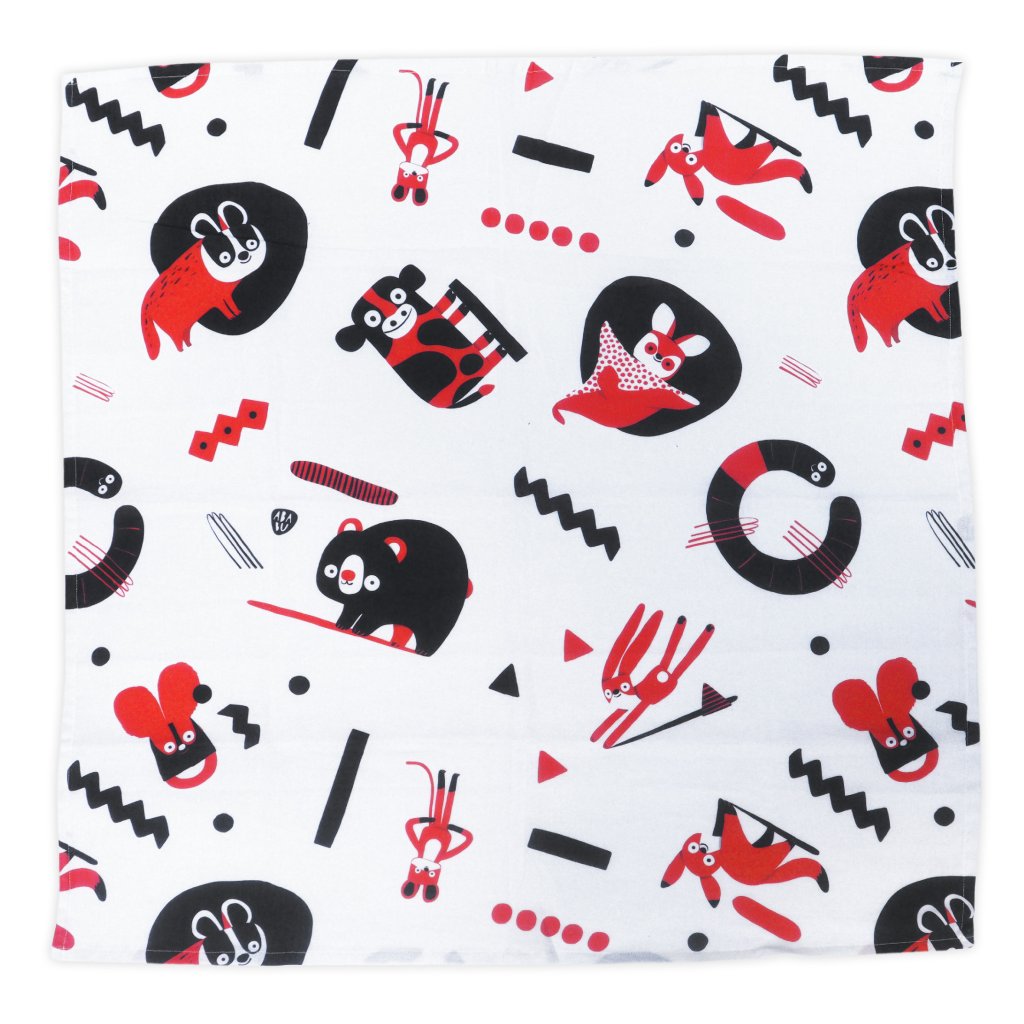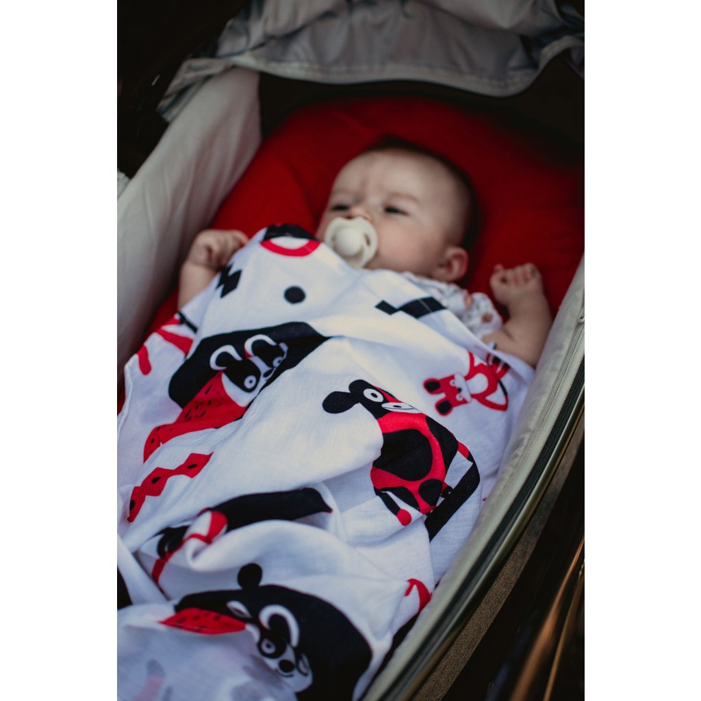 Kontrastní červeno-bílá mušelínová plena s autorskými ilustracemi od Patrika Antczaka není jen obyčejná plena. Je to praktický pomocník, který podporuje vývoj zraku, nervového systému i první motoriky miminka — přirozeně, jemně a zábavně.