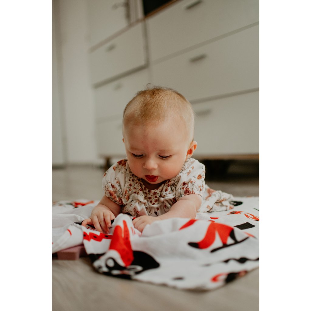 Miminka milují kontrasty. Černá, sytá červená a jasná bílá barva přitahují pozornost a pomáhají děťátku soustředit se na tvary a vzory, které rozvíjejí jeho zvědavost a uklidňují ho při přebalování, na cestách i při mazlení.