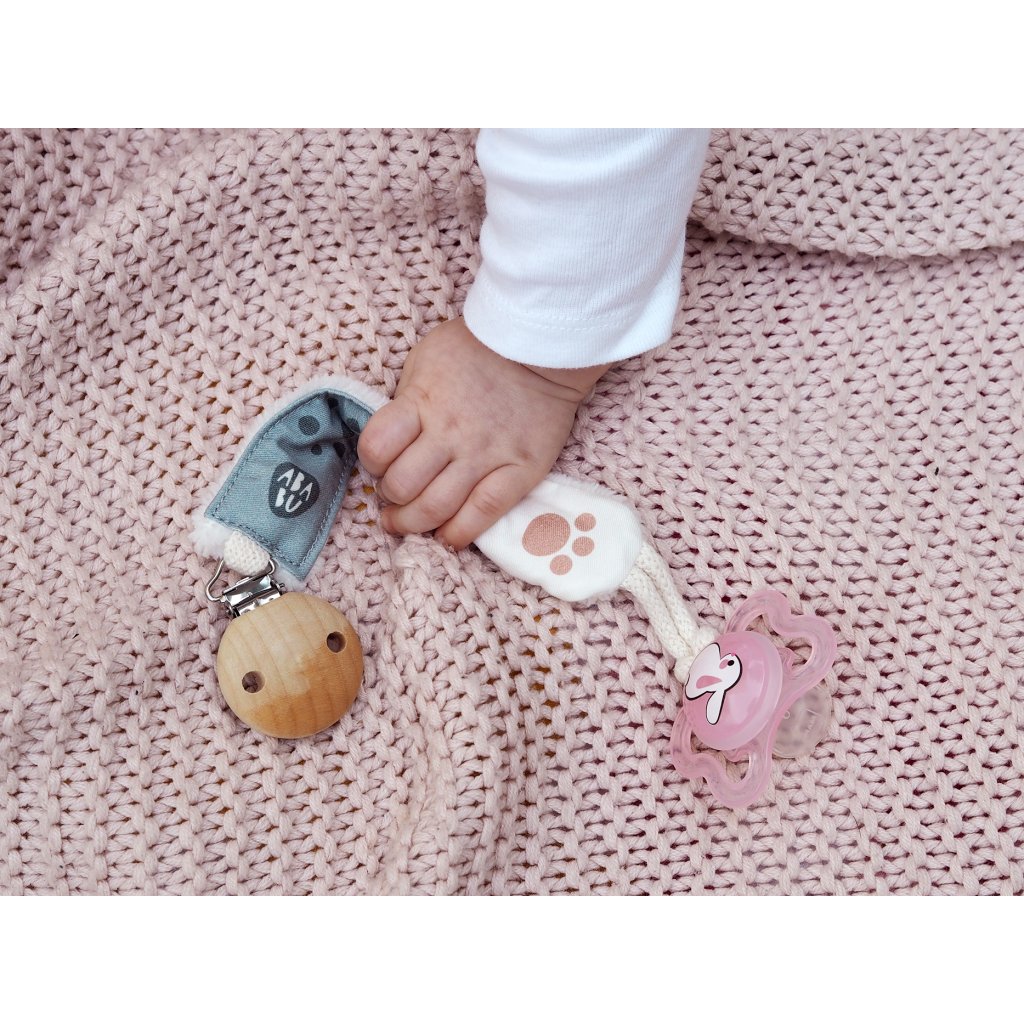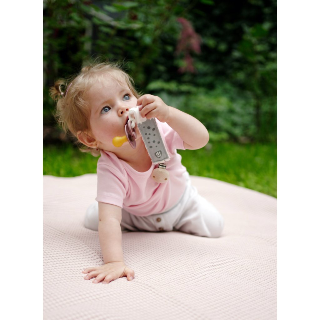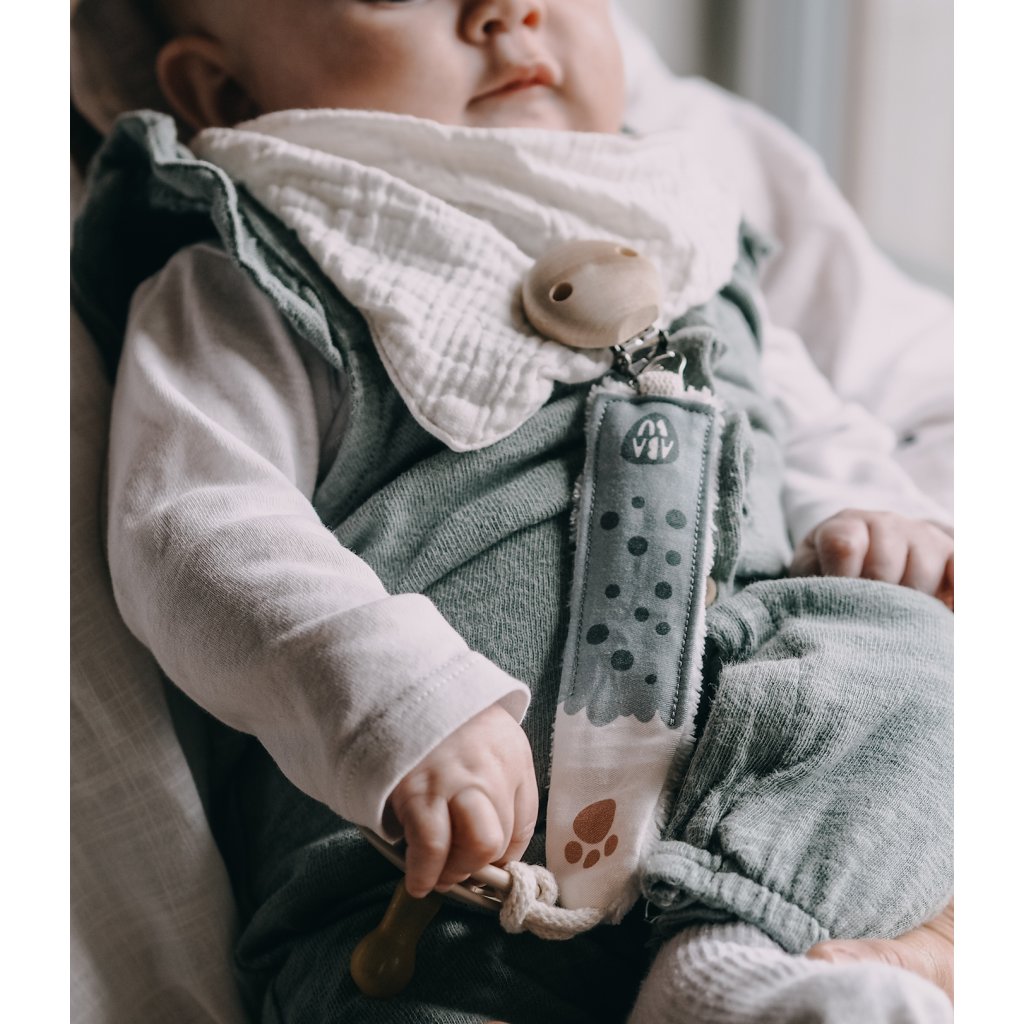 Klip na dudlík jemně šustí, podporuje motoriku a bystří sluch miminka. Z druhé strany je savé froté, ideální k pohlcování slin při ocucávání. Dřevěný klip je kvalitní český výrobek, který se snadno otevírá a jeho kovové části neobsahují nikl. Dva bezpečnostní dýchací otvory pak předejdou udušení miminka. Nejen v kočárku ušetří pacička spoustu času s hledáním dudlíku, který zůstane už navždy čistý.