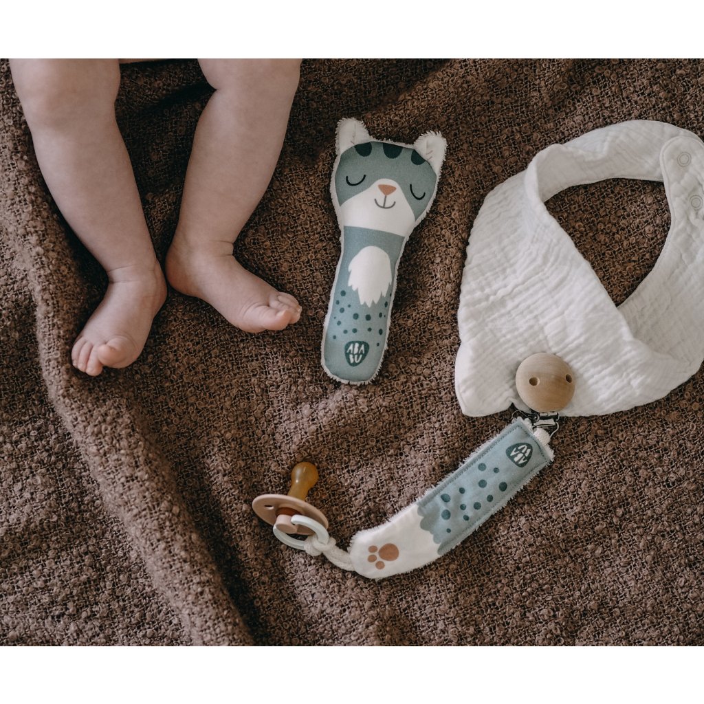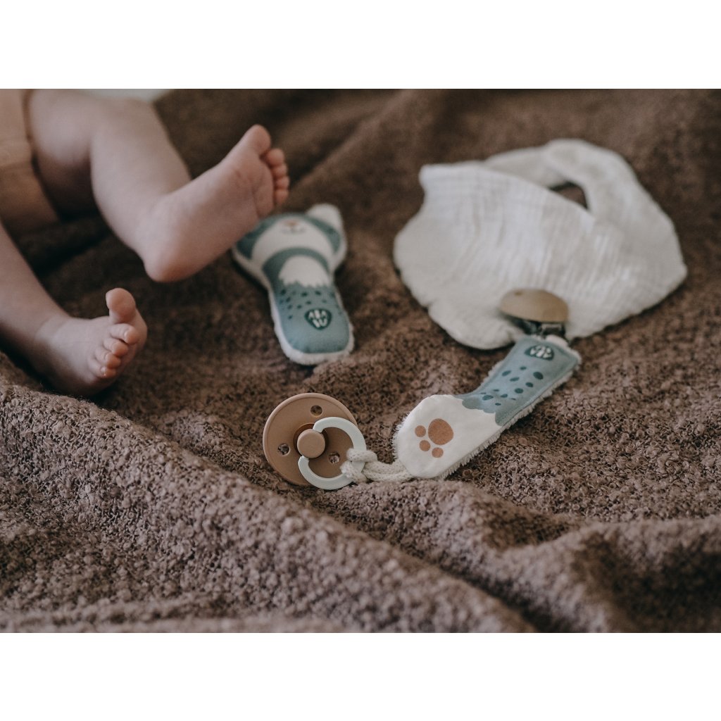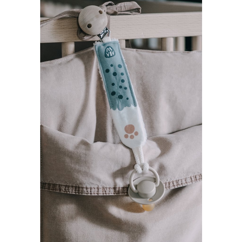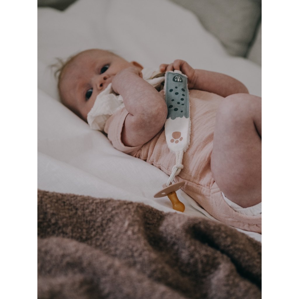 Klip na dudlík jemně šustí, podporuje motoriku a bystří sluch miminka. Z druhé strany je savé froté, ideální k pohlcování slin při ocucávání. Dřevěný klip je kvalitní český výrobek, který se snadno otevírá a jeho kovové části neobsahují nikl. Dva bezpečnostní dýchací otvory pak předejdou udušení miminka. Nejen v kočárku ušetří pacička spoustu času s hledáním dudlíku, který zůstane už navždy čistý.