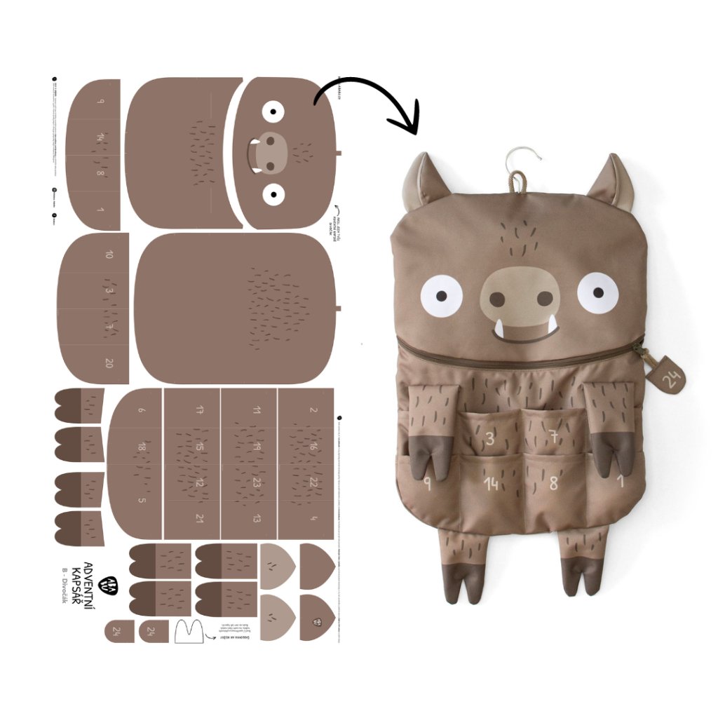 Předtištěný střih na nepromokavé látce na ušití adventního kalendáře ve tvaru divokho prasátka. Vykouzlete dětem tu pravou vánoční atmosféru a připravte jim originální adventní kalendář! S naší předtištěnou látkou na vánoční kapsář to bude hračka, navíc velkou radost udělá i vám, když ho sami nejprve ušijete! Z pevného nepromokavého materiálu si ušijete závěsný kapsář s 24 označenými přihrádkami na vkládání malých dárečků. Po všití zipu vznikne největší kapsa, která odtajní svůj obsah až na Štědrý den.