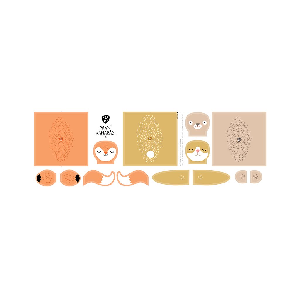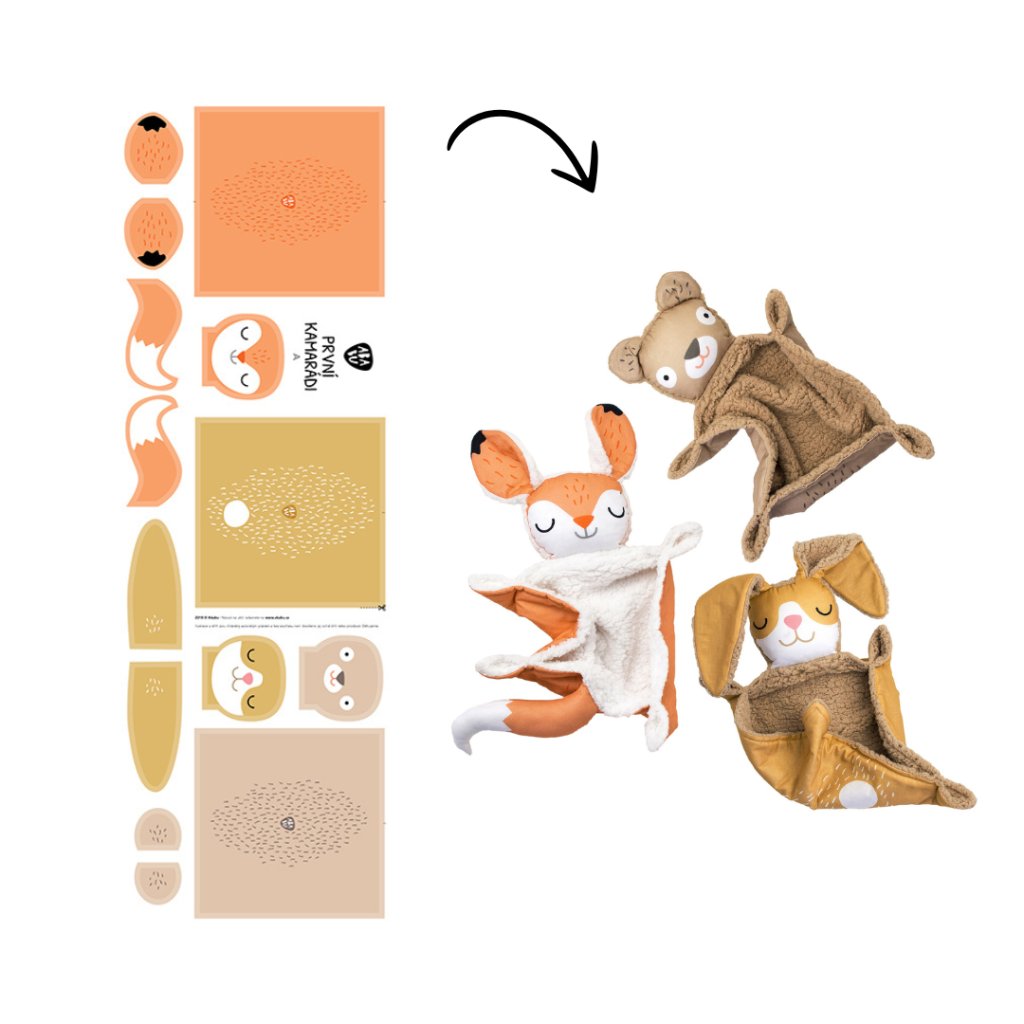 Předtištěná látka na ušití 3 hraček pro miminko. Ideální kombinace pro začínající švadlenky. Výhodné 3v1 - střih, design a látka. Stačí vystřihnout a sešít!