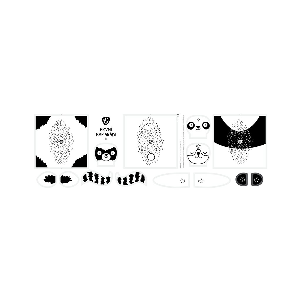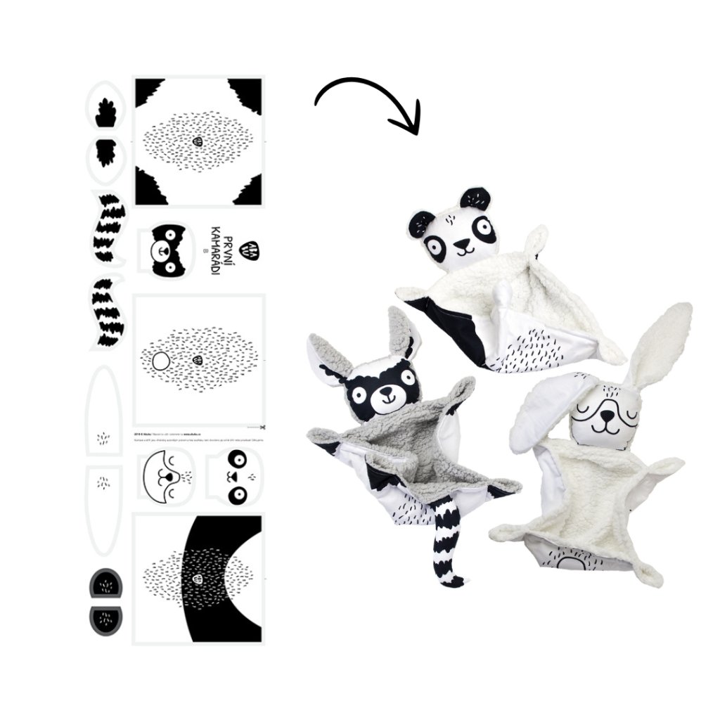 Předtištěná látka na ušití 3 hraček pro miminko. Ideální kombinace pro začínající švadlenky. Výhodné 3v1 - střih, design a látka. Stačí vystřihnout a sešít! Miminka vidí nejprve jen černobíle a dobře reagují na kontrasty. Tato sada černobílých kamarádů v podobě pandy, mývala a zajíčka bude fascinovat miminko od prvního okamžiku.