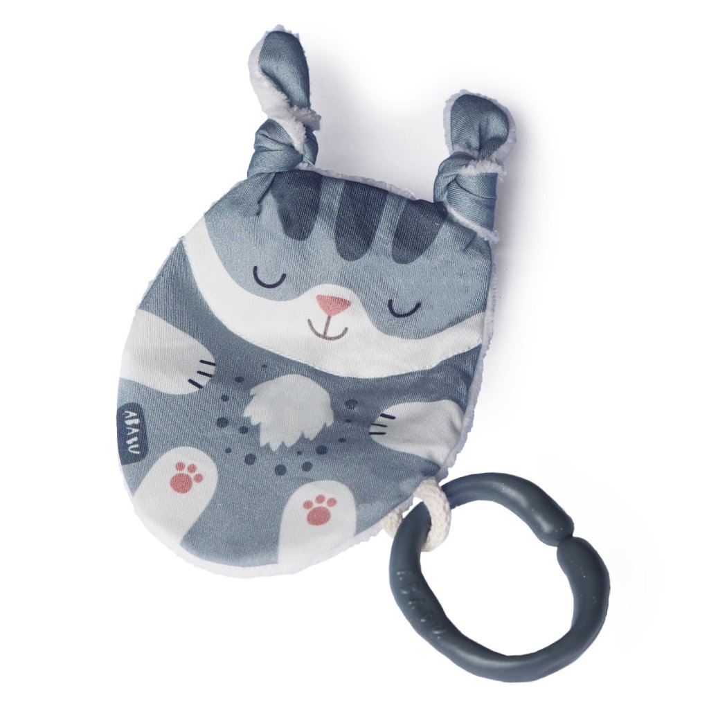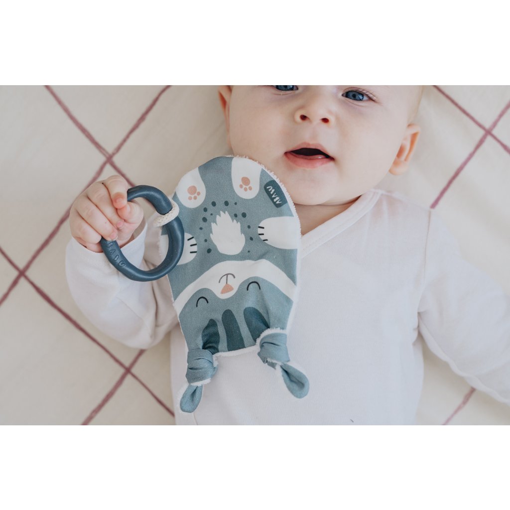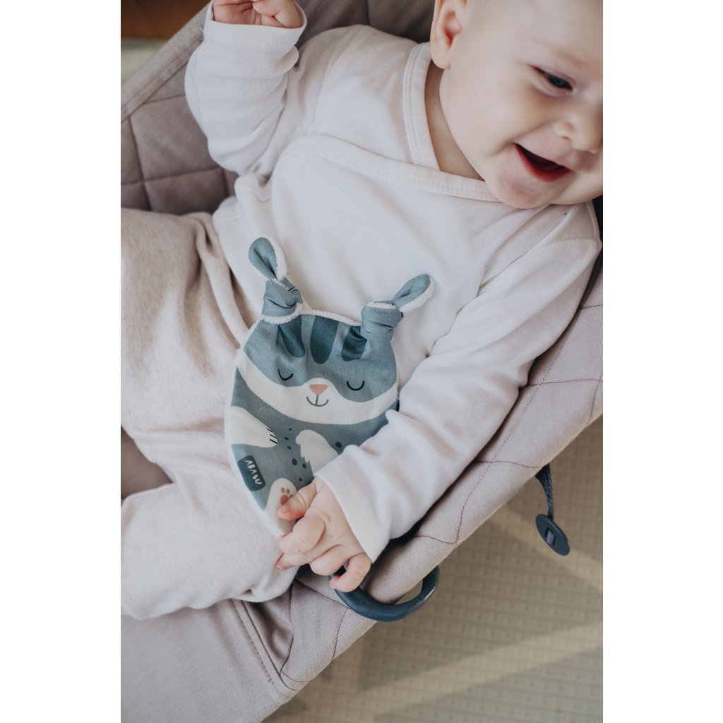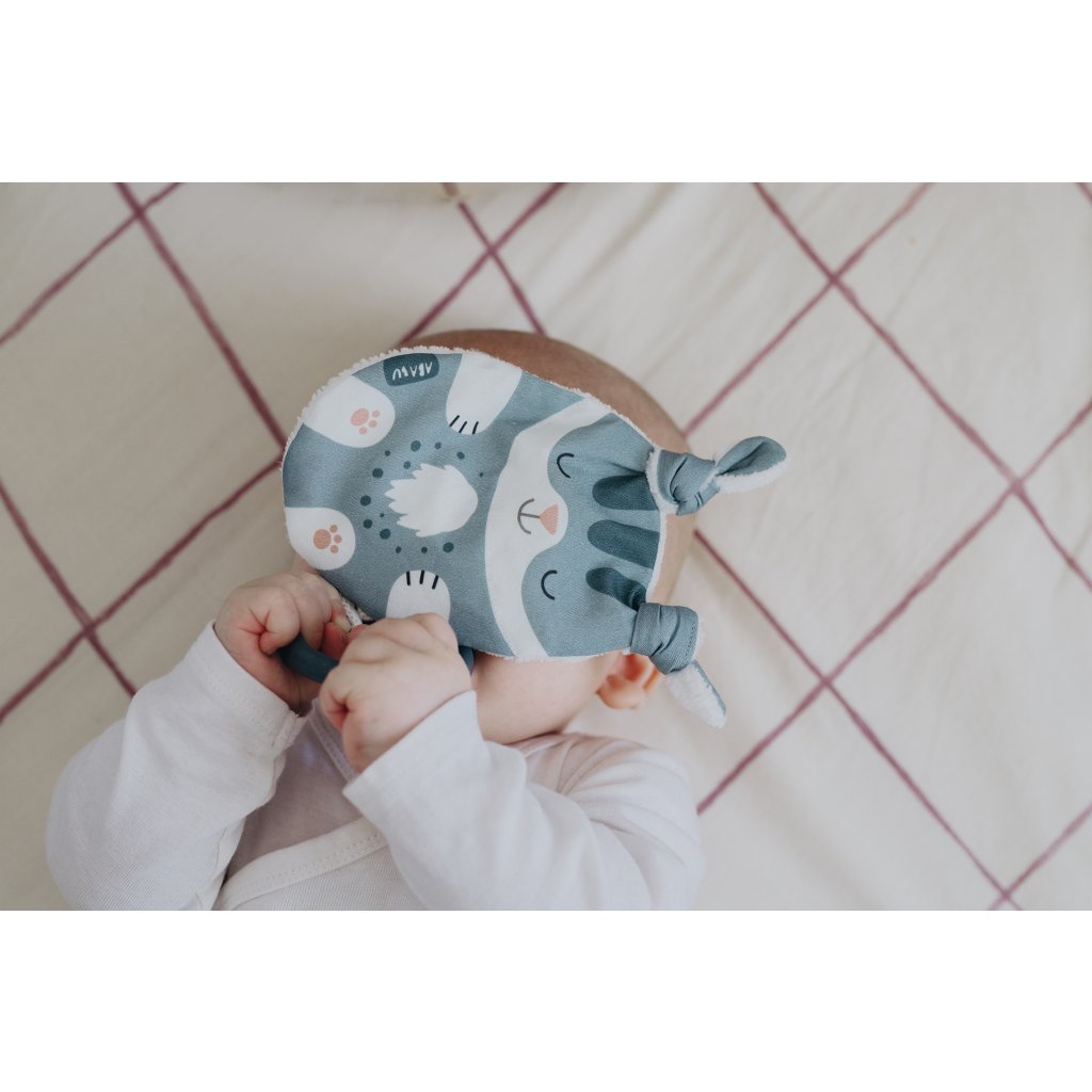 Tvar a velikost jsou ideální pro malé dětské ručičky. Při pokusech o první úchopy jemně praská. Zamotané uši můžete podle chuti rozvázat, ale jeho uzlíky se budou báječně ocucávat. Zadní strana z bambusového heboučkého froté je super savá a odvede veškerou vlhkost při ocucávání. Bambus je přirozeně antiseptický a uschne závratnou rychlostí.