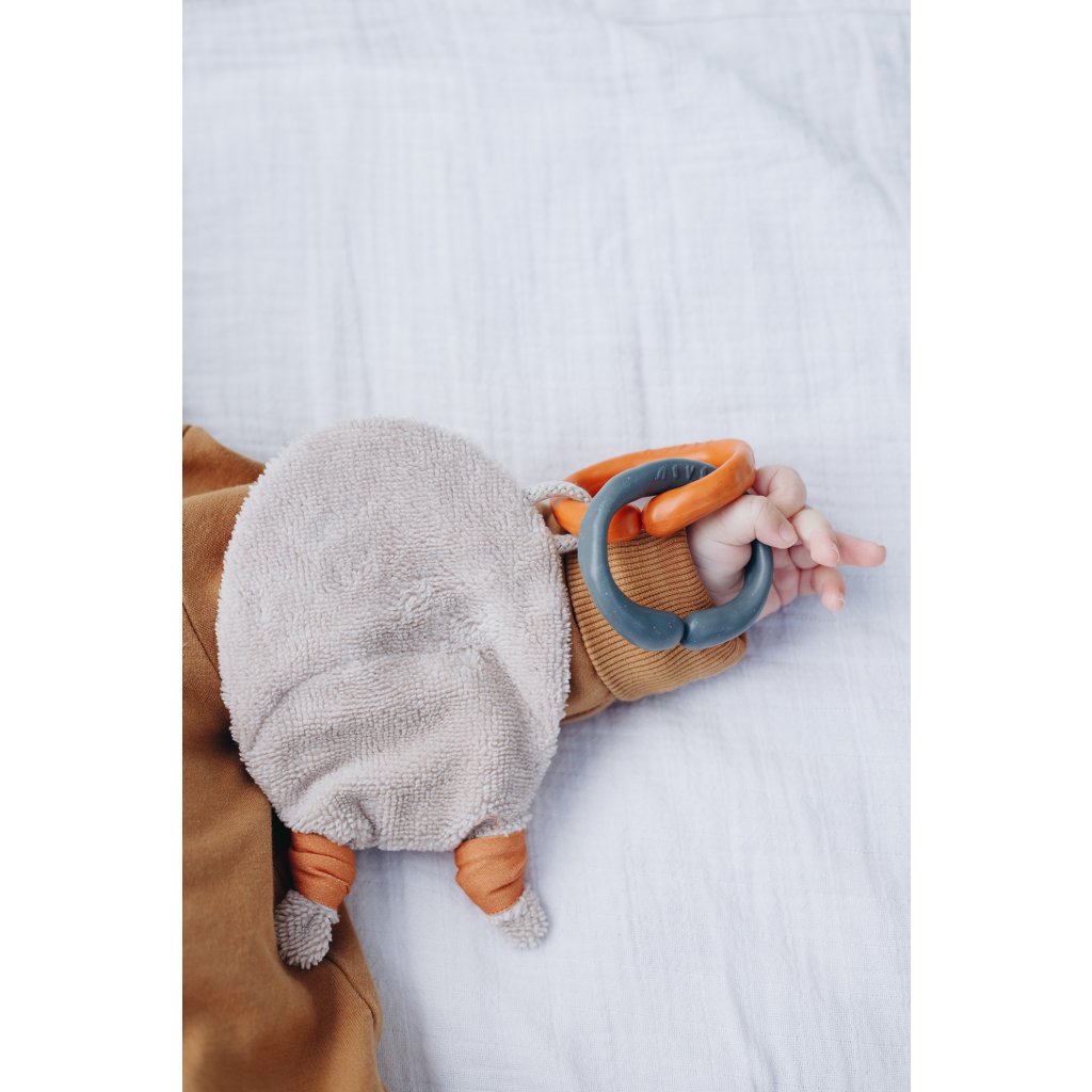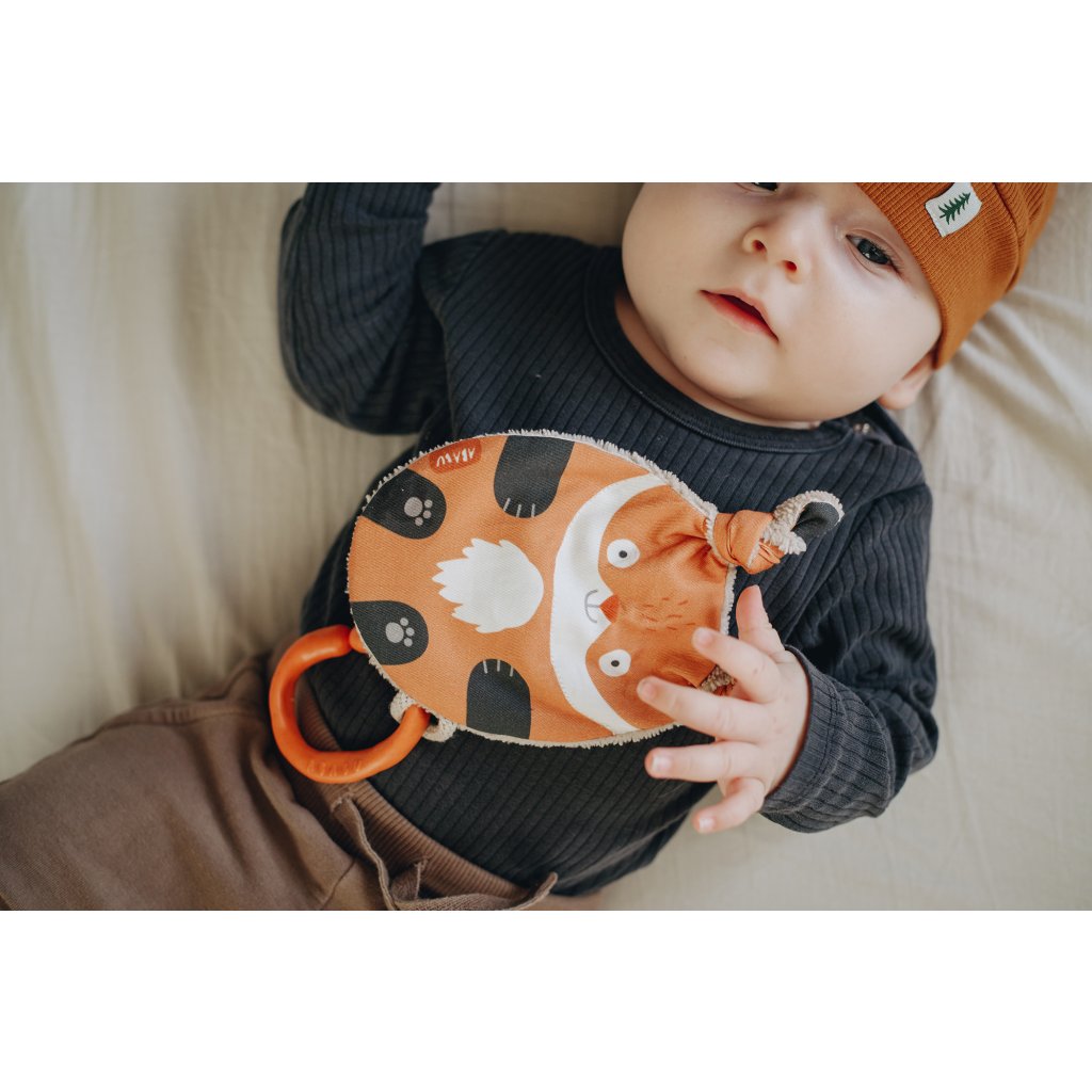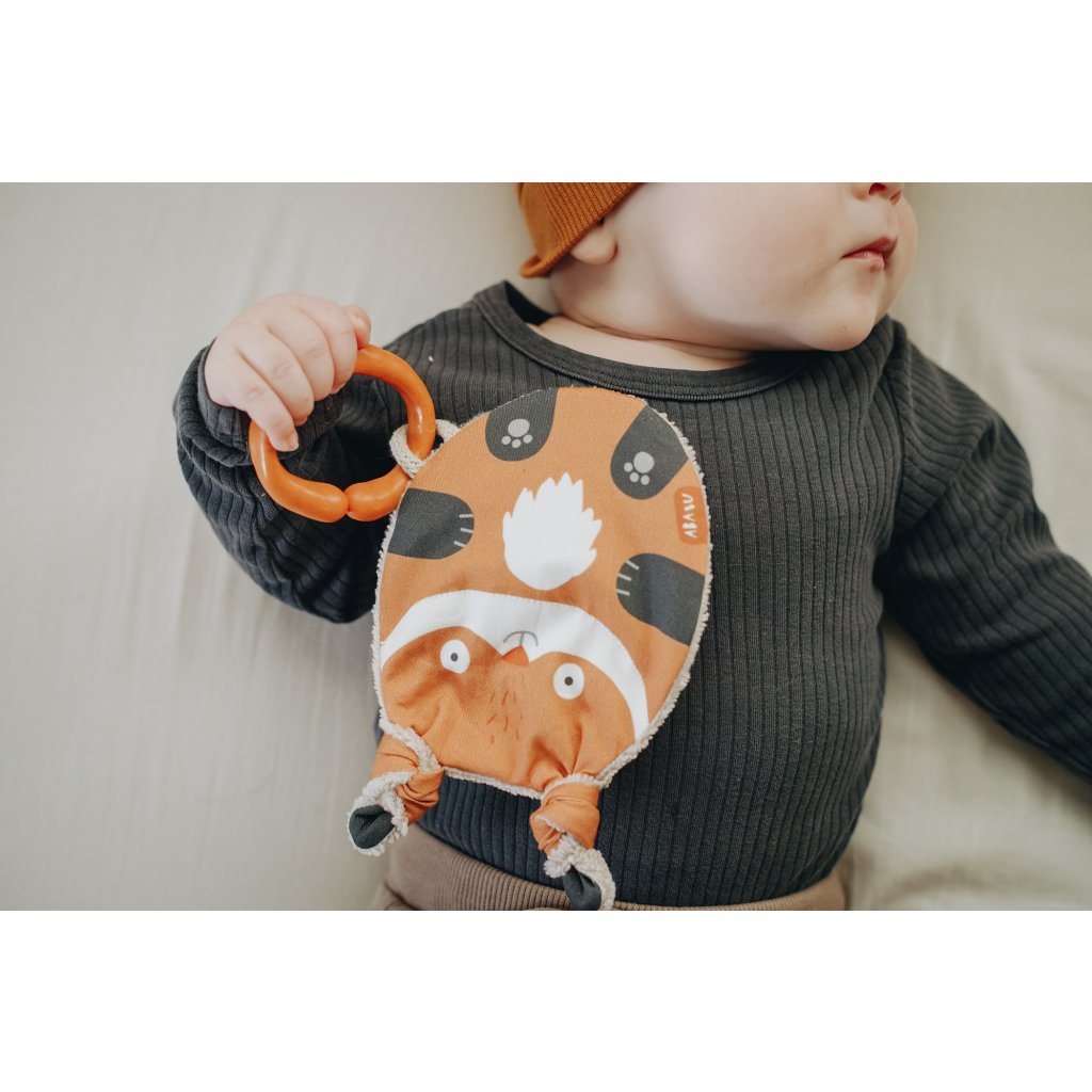 Tvar a velikost jsou ideální pro malé dětské ručičky. Při pokusech o první úchopy jemně praská. Zamotané uši můžete podle chuti rozvázat, ale jeho uzlíky se budou báječně ocucávat. Zadní strana z bambusového heboučkého froté je super savá a odvede veškerou vlhkost při ocucávání. Bambus je přirozeně antiseptický a uschne závratnou rychlostí.