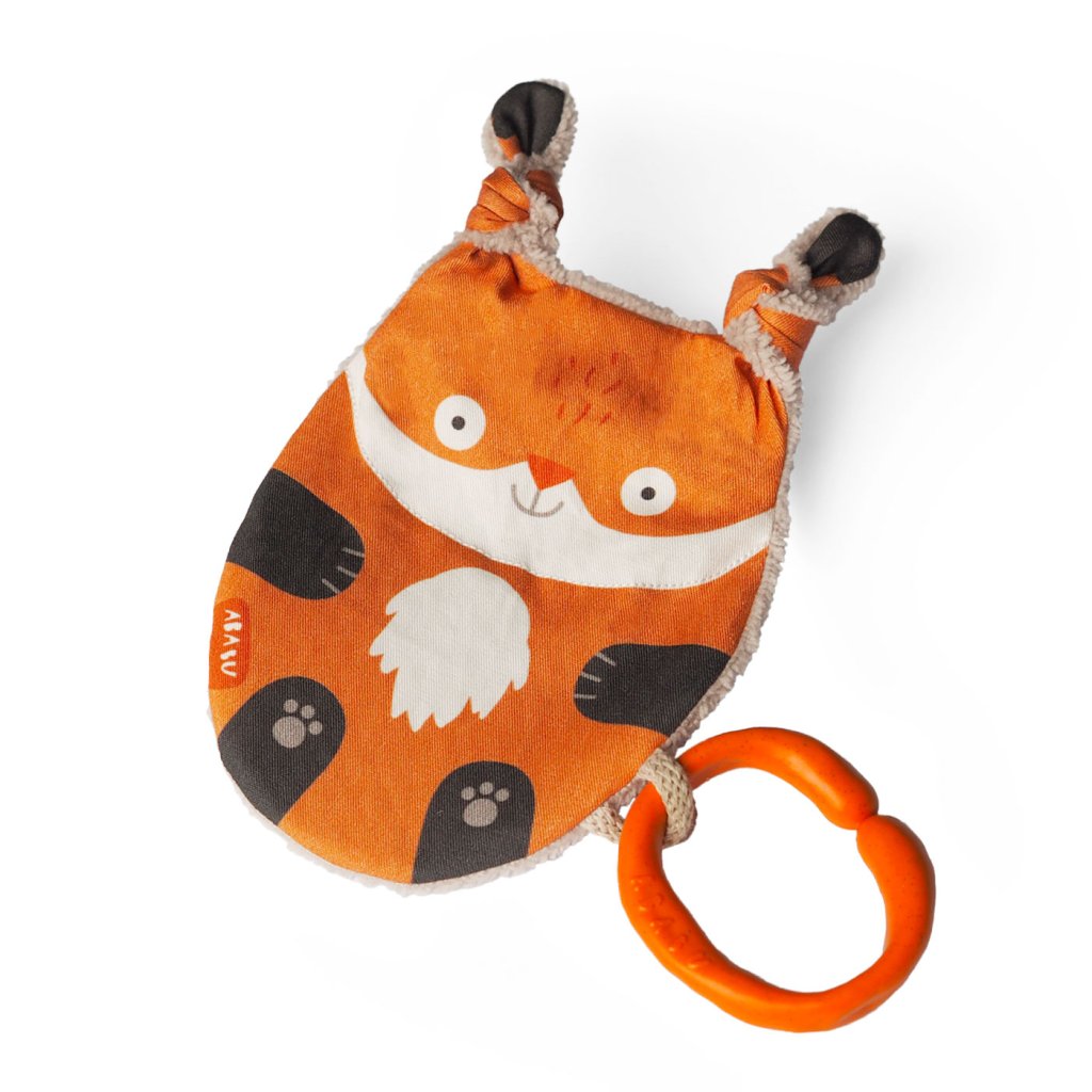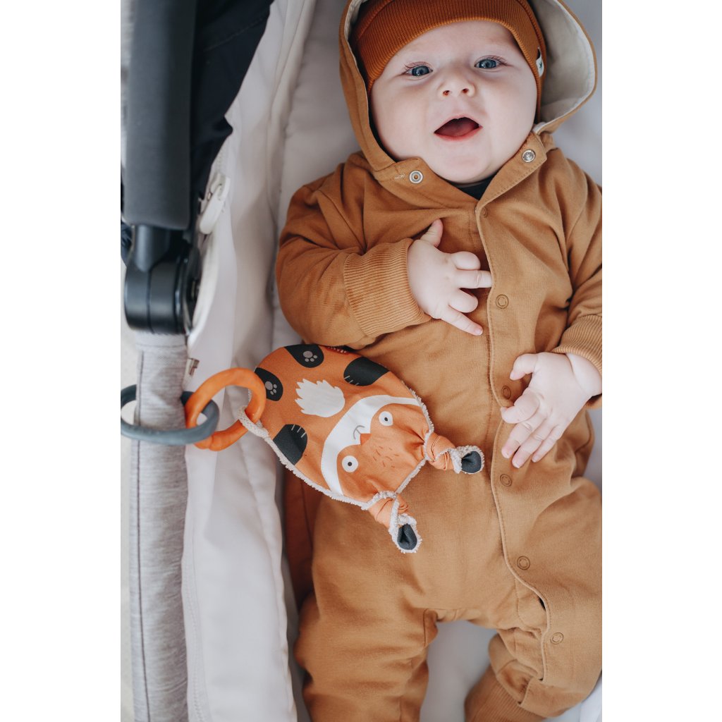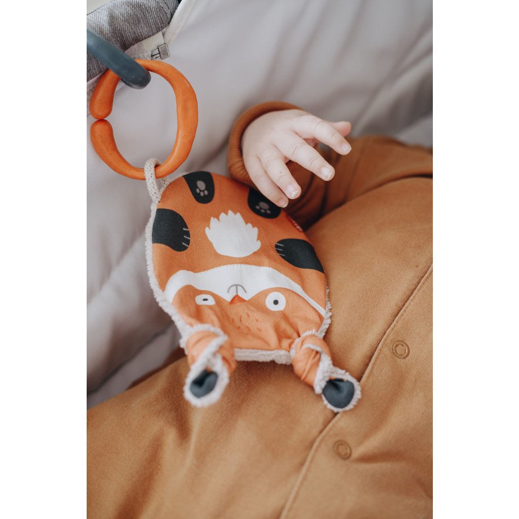 Tvar a velikost jsou ideální pro malé dětské ručičky. Při pokusech o první úchopy jemně praská. Zamotané uši můžete podle chuti rozvázat, ale jeho uzlíky se budou báječně ocucávat. Zadní strana z bambusového heboučkého froté je super savá a odvede veškerou vlhkost při ocucávání. Bambus je přirozeně antiseptický a uschne závratnou rychlostí.