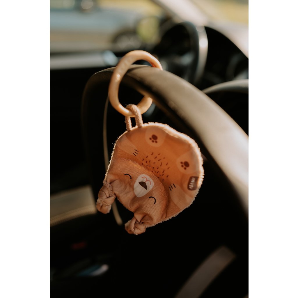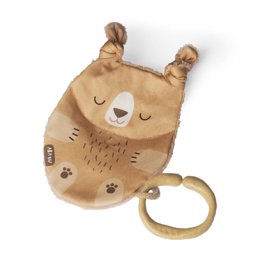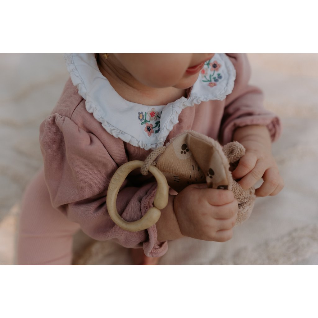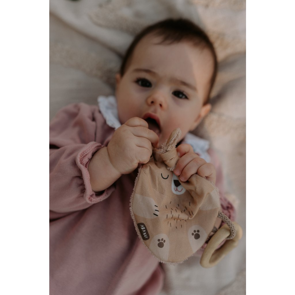 Tvar a velikost jsou ideální pro malé dětské ručičky. Při pokusech o první úchopy jemně praská. Zamotané uši můžete podle chuti rozvázat, ale jeho uzlíky se budou báječně ocucávat. Zadní strana z bambusového heboučkého froté je super savá a odvede veškerou vlhkost při ocucávání. Bambus je přirozeně antiseptický a uschne závratnou rychlostí.