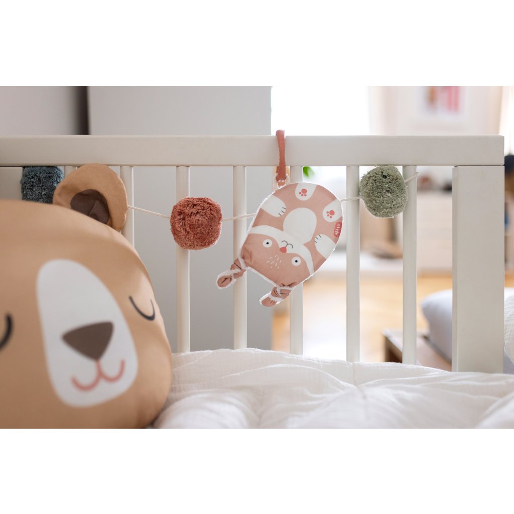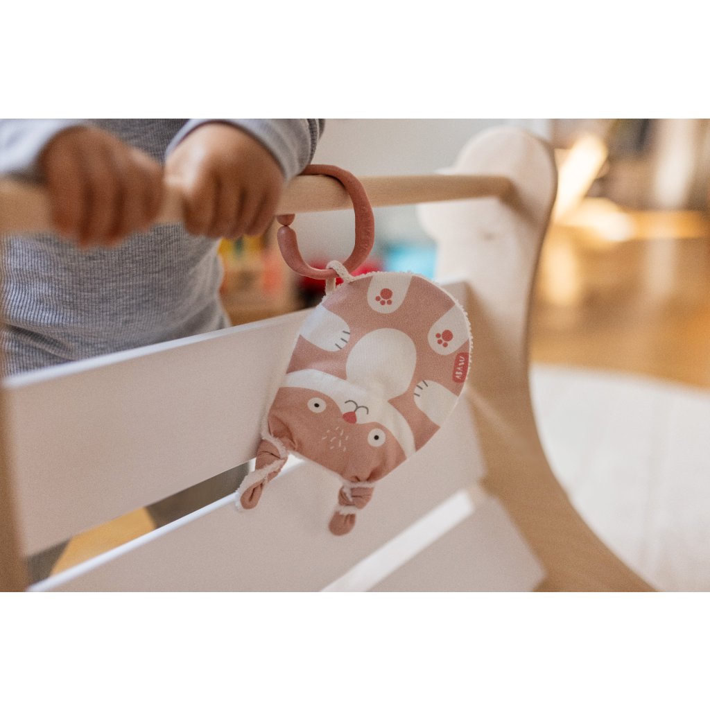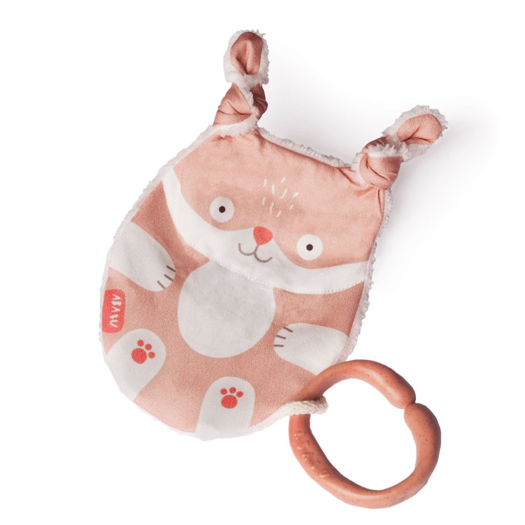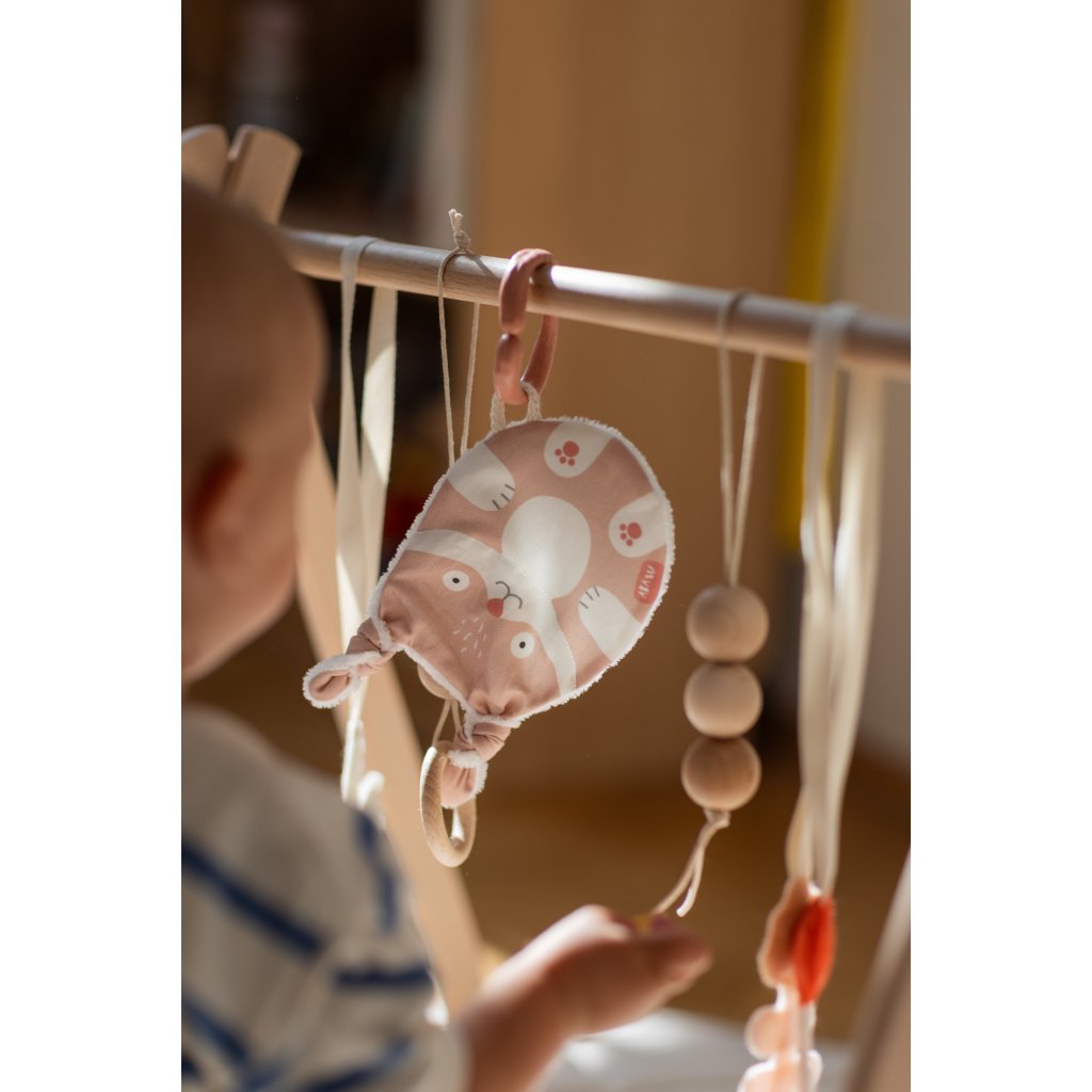 Tvar a velikost jsou ideální pro malé dětské ručičky. Při pokusech o první úchopy jemně praská. Zamotané uši můžete podle chuti rozvázat, ale jeho uzlíky se budou báječně ocucávat. Zadní strana z bambusového heboučkého froté je super savá a odvede veškerou vlhkost při ocucávání. Bambus je přirozeně antiseptický a uschne závratnou rychlostí.